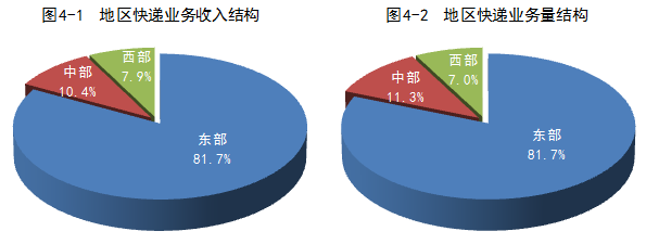 1-8月,东、中、西部地区快递业务收入的比重分别为81.7%、10.4%和7.9%,业务量比重分别为81.7%、11.3%和7%。与去年同期相比,东部地区快递业务收入比重下降了1.2个百分点,快递业务量比重持平;中部地区快递业务收入比重上升了1个百分点,快递业务量比重上升了0.5个百分点;西部地区快递业务收入比重上升了0.2个百分点,快递业务量比重下降了0.5个百分点。