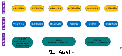 该系统由图像采集终端, 数据处理中间件,以及图像处理软件组合形成,在集装箱通过时,通过预设数据采集区域,自动获取集装箱箱号、箱型等信息,并将相关数据上传至数据库待前台程序调用,并将相关照片上传至指定网络位置进行分类存储。
