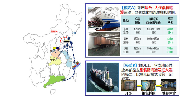 模式A:华中、华东、华北供应商生产的零部件,采用通过烟台-大连轮渡模式进行多式联运调达运输。