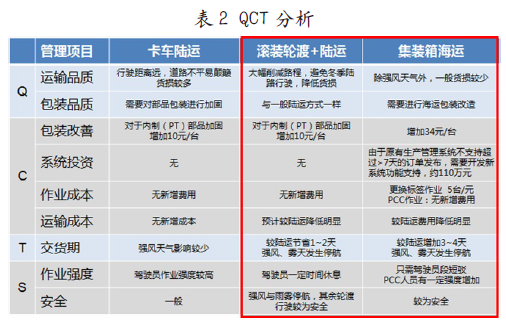 为降低运输费用,上海通用汽车是国内首家采用国产集装箱近海海运、江运调达运输的公司,运输规模也属于国内行业最大。自2003年运营以来,开发运用了适用于近海运输的包装及防护方式,并实现了集装箱装载仿真系统开发。上世纪90年代开始,日本开始导入海运模式,目前日本日产已拥有4条滚装船,实行零部件甩挂模式,并与商品车共用滚装船,主要在追浜-九州“大动脉”航线对流运输。