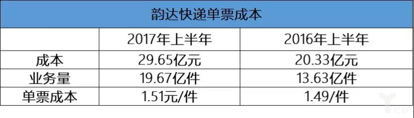 韵达在2017年上半年单票快递产品成本从1.49元上升到1.51元。
