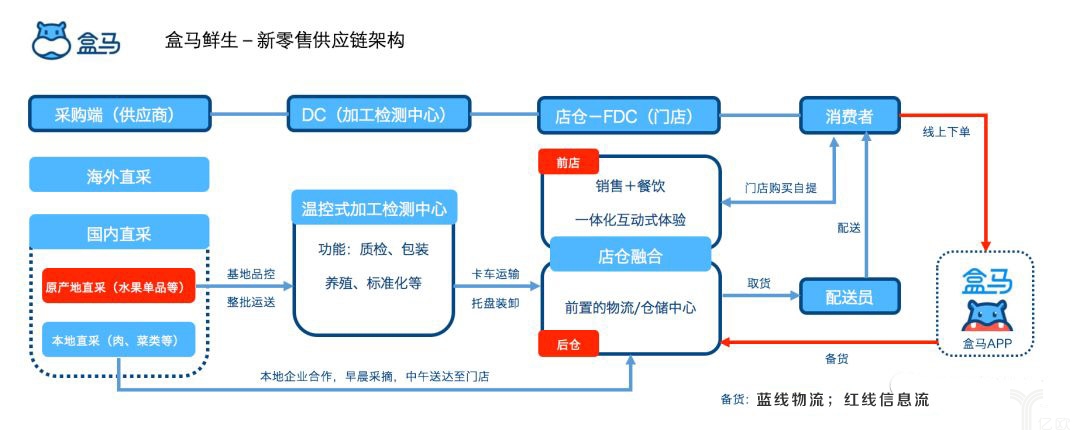 对于盒马来说,生鲜仅仅是其一个出入口,其既有生鲜卖场,又是一个电商平台。相同的是在这两个版块,盒马都要做,且做出了物流供应链的创新: