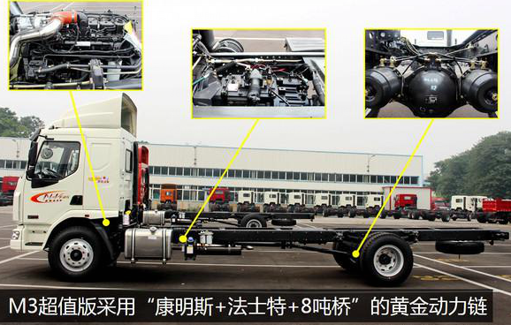 与这款表现非常好的六缸发动机组成黄金动力链的还有法士特8JS75C八档变速箱。相比六档箱,搭配法士特8JS75C 八档箱每个档位间的速比极差更小,使得乘龙M3超值版工况适应性更强,且换挡更加平顺,无论任何路况都能平稳地提供强劲的马力。另外,与乘龙M3超值版的黄金动力链相匹配的8吨后桥,最小速比可达到4.875,传动效率更高,而且配置经典,成熟可靠,社会保有量大。