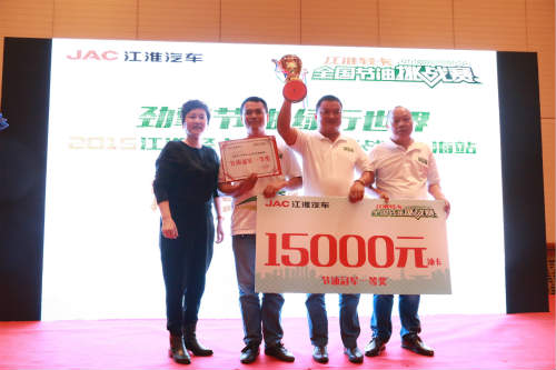 比赛前,齐聚一堂的各参赛车队剑拔弩张,为此次征战做着最后的准备,其中来自武汉大道物流的领队就今天的赛事路况与选手们进行了激烈讨论,另一支来自合肥宏庆运输的选手们就各自驾驶车型如何更加节油展开了深入探讨。下午3:00时分,比赛正式开始,来自景光物流、万家物流、安能物流、宏庆运输、大道物流、安杰货运共6支参赛队伍依次驶出起点,在全程100余公里,涵盖城市、高速、城乡的综合物流路段展开激烈角逐。经过2小时的比拼,最终来自武汉的大道物流车队以总成绩18.1L夺得了2015江淮轻卡全国节油挑战赛团队总冠军,特别值得一提的是,大道物流车队的陈文祥和宏庆运输车队的刘传红分获帅铃迈斯福组、骏铃迈斯福组单项冠军,其中,刘传红以5.9L/百公里的优异成绩刷新迈斯福动力节油新纪录。
