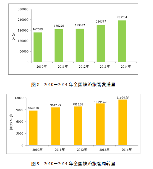 全年全国铁路完成旅客发送量23.57亿人,旅客周转量11604.75亿人公里,比上年分别增长11.9%和9.5%。其中,国家铁路完成23.24亿人,11556.36亿人公里,分别增长12.0%和9.5%。