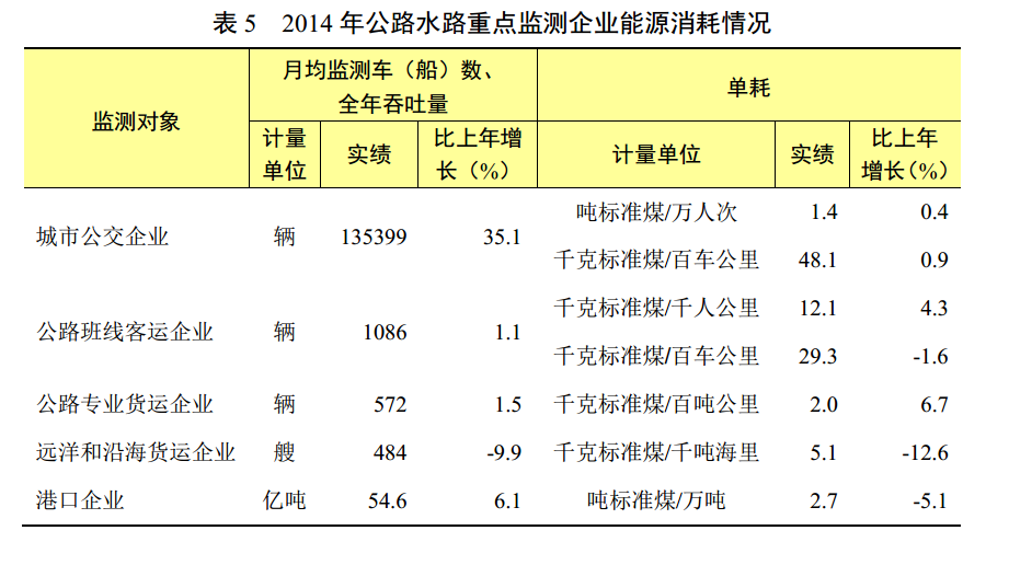全年共监测公路水路运输企业125家。监测的城市公交企业每万人次单耗1.4吨标准煤,比上年增长0.4%,百车公里单耗48.1千克标准煤,增长0.9%;公路班线客运企业每千人公里单耗12.1千克标准煤,增长4.3%,百车公里单耗29.3千克标准煤,下降1.6%;公路专业货运企业每百吨公里单耗2.0千克标准煤,增长6.7%;远洋和沿海货运企业每千吨海里单耗5.1千克标准煤,下降12.6%;港口企业每万吨单耗2.7吨标准煤,下降5.1%。