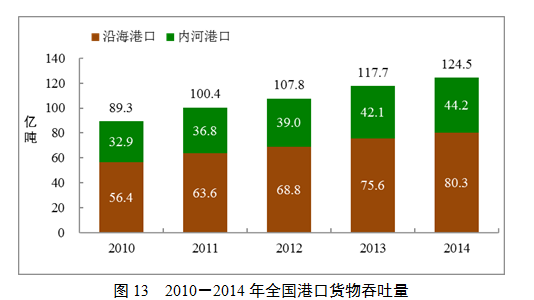 全年全国港口完成货物吞吐量124.52亿吨,比上年增长5.8%。其中,沿海港口完成80.33亿吨,内河港口完成44.19亿吨,分别增长6.2%和5.1%。