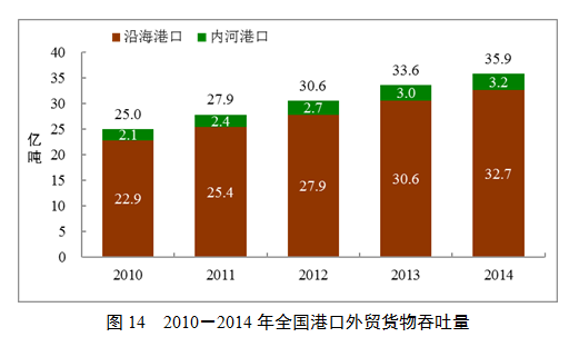 全国港口完成外贸货物吞吐量35.90亿吨,比上年增长6.9%。其中,沿海港口完成32.67亿吨,内河港口完成3.23亿吨,分别增长6.9%和6.8%。