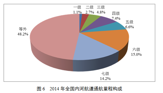 各等级内河航道通航里程分别为:一级航道1341公里,二级航道3443公里,三级航道6069公里,四级航道9301公里,五级航道8298公里,六级航道18997公里,七级航道17913公里。等外航道6.09万公里。