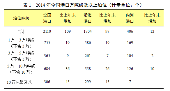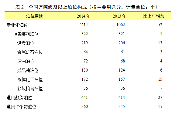 全国万吨级及以上泊位中,专业化泊位1114个,通用散货泊位441个,通用件杂货泊位360个,比上年末分别增加52个、27个和15个。
