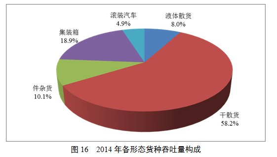 全国港口完成液体散货吞吐量9.97亿吨,比上年增长5.1%;干散货吞吐量72.46亿吨,增长4.9%;件杂货吞吐量12.52亿吨,增长7.3%;集装箱吞吐量(按重量计算)23.49亿吨,增长7.5%;滚装汽车吞吐量(按重量计算)6.09亿吨,增长9.4%。