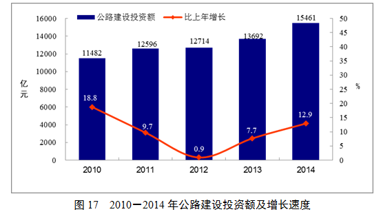 全年完成公路建设投资15460.94亿元,比上年增长12.9%。其中,高速公路建设完成投资7818.12亿元,增长7.1%。普通国省道建设完成投资4611.82亿元,增长18.9%。农村公路建设完成投资3030.99亿元,增长20.4%,新改建农村公路23.21万公里。纳入《集中连片特困地区交通建设扶贫规划纲要(2011-2020)》的505个贫困县完成公路建设投资3442.92亿元,增长8.1%,占全国公路建设投资22.3%。