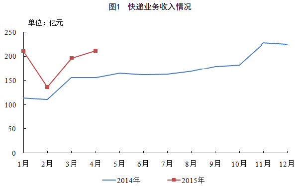 1-4月,邮政企业和全国快递服务企业业务收入(不包括邮政储蓄银行直接营业收入)累计完成1205.4亿元,同比增长23.4%;业务总量累计完成1357.1亿元,同比增长29.1%。