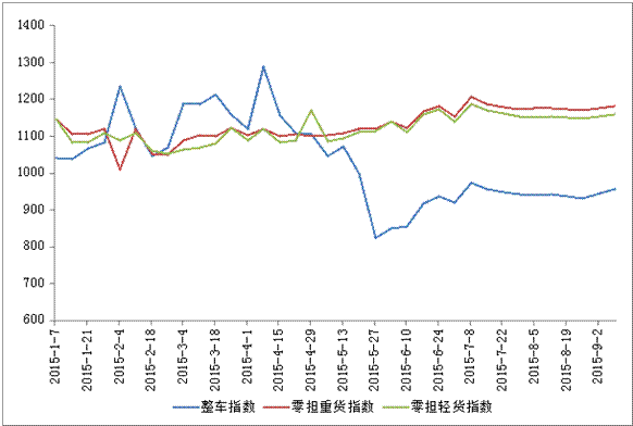 分车型指数环比均有所回升,其中整车指数为956.9 点,比上周回升0.53 %,比年初回落6.7%;零担轻货指数为1181.7点,比上周回升0.49 %,比年初回升6.4 %;零担重货指数为1158.8点,比上周回升0.48 %,比年初回升4.7 %。