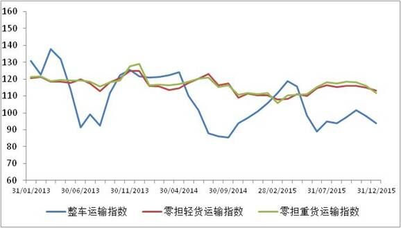 由中国物流与采购联合会和广东林安物流集团联合调查的中国公路物流运价指数2015年12月为101.3点,比上月回落3.5%,比去年同期回落3.4%,全年总体低于去年同期水平。