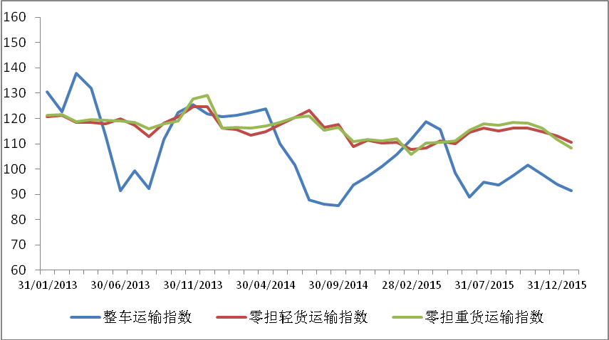 从分车型指数看,受到需求回落及油价走低等综合因素影响,各车型指数均不同程度回落;其中,整车指数、零担重货指数回落幅度高于零担轻货指数,显示出食品、日用品等民生消费需求总体好于大宗商品需求。从数据看,整车指数比上月回落2.8%,为91.3点。零担轻货指数为110.5点,比上月回落2.3%,但与去年同期基本持平;零担重货指数为108.3点,比上月回落3.0%,比去年同期回落3.2%。