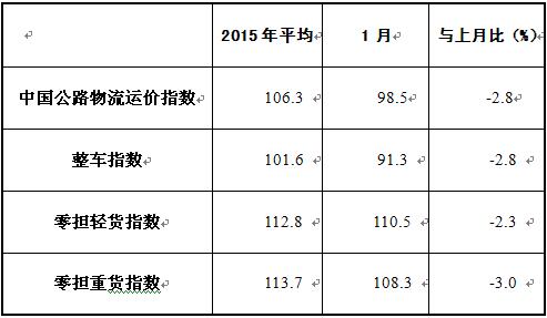 由中国物流与采购联合会和广东林安物流集团联合调查的中国公路物流运价指数2016年1月为98.5点,比上月回落2.8%,比去年同期回落8.7%。从历史同期看春节前运价指数多为回升,今年受到油价走低等因素影响,总体低于去年同期平均水平。