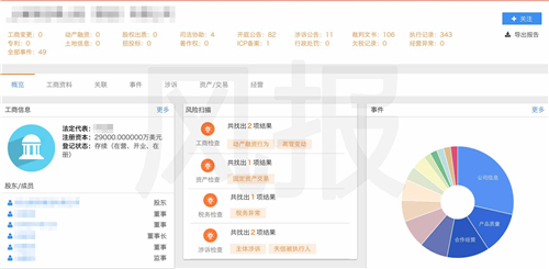 在海量的工商、税务、涉诉和事件的基础上,风报系统通过缜密分析,结合大数据技术,第一时间告知企业的经营状况,将关键的商业信息传播给更多企业用户,增强企业间的信任度,并有效提高合作效率。