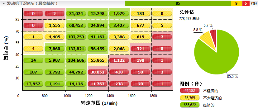 将车辆尽量保持在高挡位,也是让车辆达到最佳经济性的方法之一。从上表可以看出,先比1月份,该车辆3月份挡位配合得更好,最高挡行驶占比更大。
