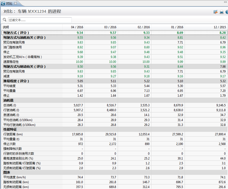 可以看出,在车队平均重量、平均速度基本保持不变的情况下,车队4台车平均驾驶得分稳步上升,从8.7分提升至稳定在9.5分;车队平均油耗逐月下降,从接近32L/100km,下降至27.5L/100km,平均油耗下降4.5L,降幅达13.7%。