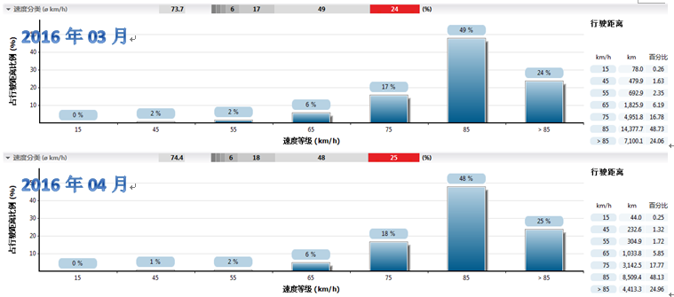 经过培训和驾驶员自身的实践,从2016年3月开始,驾驶员已经能够长时间将车速控制在经济车速区域,几乎占据整个运营里程的一半。而从之前的数据表中,我们看到实际上车辆全程的平均速度并没有产生明显的变化,也就是说,在时效未受影响的前提下,就车速这一指标,车辆以更经济的状态在运行。