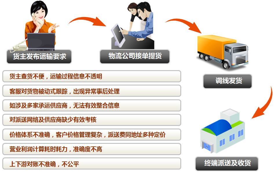 1、企业的高速发展使老式的信息系统无法配合复杂的综合物流业务,员工职责划分不明确,没有完善的管理流程及货物处理流程,造成管理效率低下,业务无法顺利扩展; 2、外站驻场员工预运单录入无法及时准确录入系统,总部和外站货物订单信息不同步。节点货物信息无法自动推送短信、微信通知,并且对签收信息无法自动获取。 3、内部信息孤岛严重,空运、陆运、供应链项目独立运作无法统一控制,货物异常率高,客服人员被动式查货,工作效率低,无法进行客户维护及售后服务,客户流失率高;货物异常率高,信息不畅,无法追根溯源找到责任人,导致企业负担大量赔偿款项;