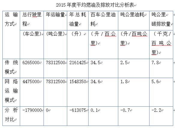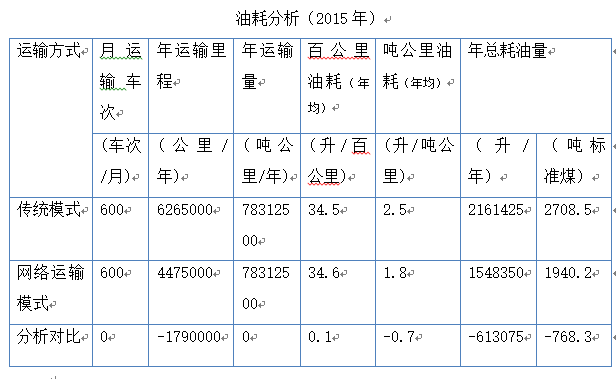 数据分析可得拟投入零担危险品网络化运输项目后,在完成同货运任务时,油耗对比可达到:(1548350-2161425)/2161425*100%=-28.4%,即在信息系统的帮助下零担危险品网络化运输项目比传统运输节油28.4%,每年可节油0#柴油613075L,合计768.3吨标准煤。