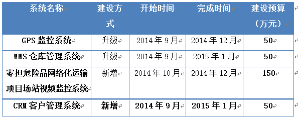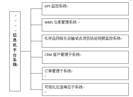 零担危险品网络化运输项目信息平台以GPS监控、WMS仓库管理系统为主,配套利用订单管理系统和短信发送平台,增加零担危险品网络化运输项目场站视频监控系统和CRM客户管理系统,以支持零担危险品网络化运输项目顺利进行。