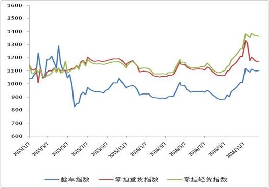 各车型指数环比涨跌不一,其中零担轻货指数环比回落,零担重货指数、整车指数小幅回升,各指数均高于上年同期水平。其中,整车指数为1101.6点,环比回升0.1%,比上年同期增长19.5%;零担轻货指数为1364.9点,环比回落0.3%;零担重货指数为1173.3点,环比回升0.1%。