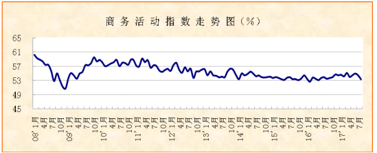 中国物流与采购联合会、国家统计局服务业调查中心发布的2017年8月份中国非制造业商务活动指数降至53.4%,环比下降1.1个百分点。53%以上的指数水平表明非制造业运行仍保持在较快增长的合理区间。