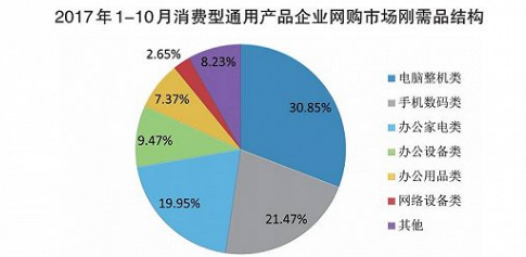 《中国企业电商化采购发展报告(2017)》显示,目前针对企业提供消费型通用产品的电子商务平台主要由综合性B2C电子商务网站的企业采购频道主导,如京东企业购、苏宁企业购、天猫企业购等。
