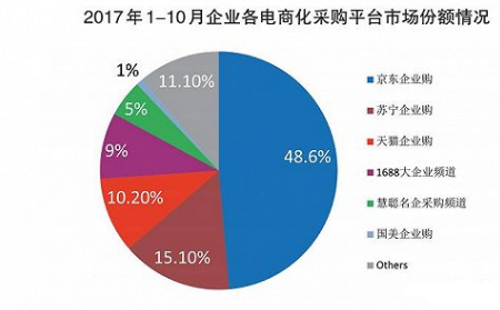 《中国企业电商化采购发展报告(2017)》显示,从其取样的覆盖对行业的上千家企业来看,京东企业购以48.6%的市场份额占据半壁江山,稳居第一名,而处于第二名的苏宁易购才仅有15.1%的市场份额,天猫企业购也只有10.2%的市场份额。