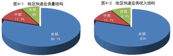 1-2月,东、中、西部地区快递业务量比重分别为80.1%、11.9%和8%,业务收入比重分别为80%、11.1%和8.9%。与去年同期相比,东部地区快递业务量比重下降了0.1个百分点,快递业务收入比重下降了0.4个百分点;中部地区快递业务量比重下降了0.1个百分点,快递业务收入比重上升了0.1个百分点;西部地区快递业务量比重上升了0.2个百分点,快递业务收入比重上升了0.3个百分点。