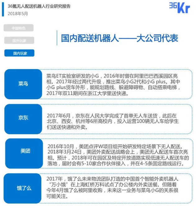36氪经过调研发现,与国外相比,中国的无人配送机器人领域的商业尝试和创业呈现出独有的特点:一是,与国外主要做室外场景不同,国内初创公司室内、室外场景并重,室内无人配送成为中国特色;二是,国外做室外配送机器人的以初创公司为主,但国内则以互联网大公司为主。
