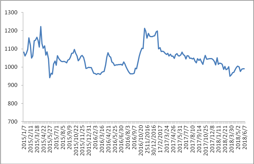 本周(2018年6月4日~6月8日),由中国物流与采购联合会和林安物流集团联合调查的中国公路物流运价指数990.35点,环比回落0.03%。