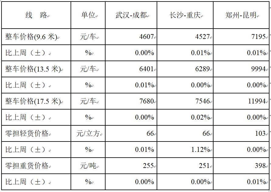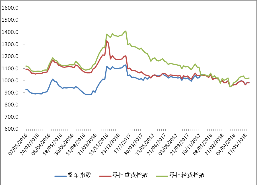 各车型指数涨跌不一,其中整车指数环比回落,零担指数则环比回升。整车指数为983.25点,环比回落0.07%。在零担指数中,零担轻货指数回升幅度略高于零担重货指数。零担轻货指数为1021.71点,环比回升0.03%;零担重货指数为982.28点,环比回升0.01%。