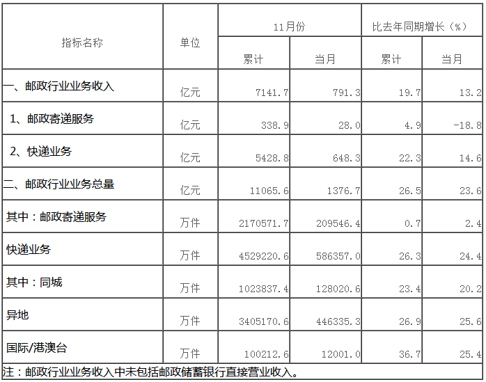 1-11月份,邮政行业业务收入(不包括邮政储蓄银行直接营业收入)累计完成7141.7亿元,同比增长19.7%;业务总量累计完成11065.6亿元,同比增长26.5%。