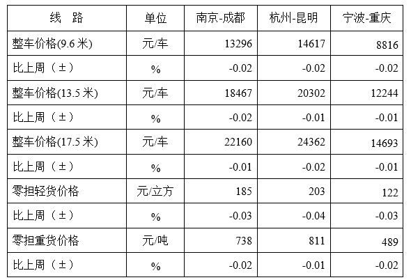 本周整车指数为970.86点,比上周回落0.02%;零担重货指数为970.69点,比上周回落0.01%;零担轻货指数为945.50点,比上周回落0.04%。
