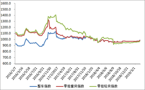 分车型看,各车型指数均有所回升。其中,整车指数为988.95点,环比回升1.47%;零担重货指数为987.87点,环比回升1.38%;零担轻货指数为973.97点,环比回升1.5%。