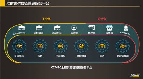 准时达(JUSDA),富士康科技集团唯一授权的供应链管理企业,全球C2M2C(Component to Manufacture to Consumer)专业供应链管理平台服务企业,为客户提供互联网时代下从原材料端到消费者端的供应链实时协同平台管理服务。准时达是工业互联网下新供应链形态的最佳实践者,协助B2B企业完成供应链升级转型及商业模式再造。