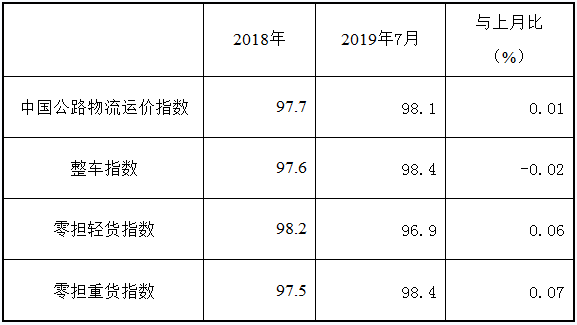 2019年7月份,由中国物流与采购联合会和林安物流集团联合调查的中国公路物流运价指数为98.1点,与上月基本持平,比去年同期回升0.7%。月内各周指数运行平缓,波动幅度在980点至981点之间。