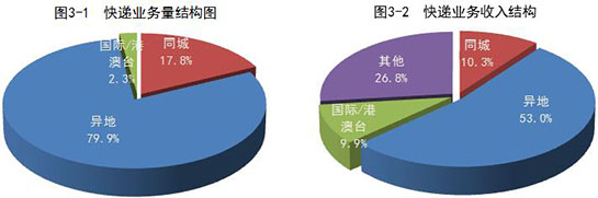 1-9月,同城、异地、国际/港澳台快递业务量分别占全部快递业务量的17.8%、79.9%和2.3%;业务收入分别占全部快递收入的10.3%、53%和9.9%。与去年同期相比,同城快递业务量的比重下降5.1个百分点,异地快递业务量的比重上升5.1个百分点,国际/港澳台业务量的比重基本持平。