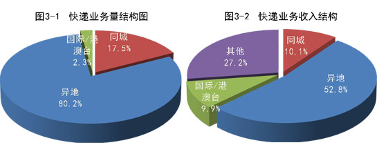 1-11月,同城、异地、国际/港澳台快递业务量分别占全部快递业务量的17.5%、80.2%和2.3%;业务收入分别占全部快递收入的10.1%、52.8%和9.9%。与去年同期相比,同城快递业务量的比重下降5.1个百分点,异地快递业务量的比重上升5个百分点,国际/港澳台业务量的比重上升0.1个百分点。