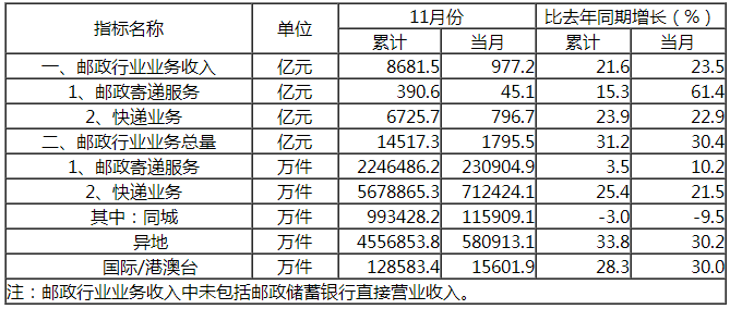 1-11月,邮政行业业务收入(不包括邮政储蓄银行直接营业收入)累计完成8681.5亿元,同比增长21.6%;业务总量累计完成14517.3亿元,同比增长31.2%。