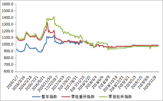 分车型看,各车型指数与上周基本持平。其中,整车指数为987.62点,比上周回升0.01%;零担重货指数和零担轻货指数分别为986.73点和968.22点,与上周基本持平。
