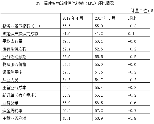 2017年4月份福建省物流业景气指数(LPI)为55.5%