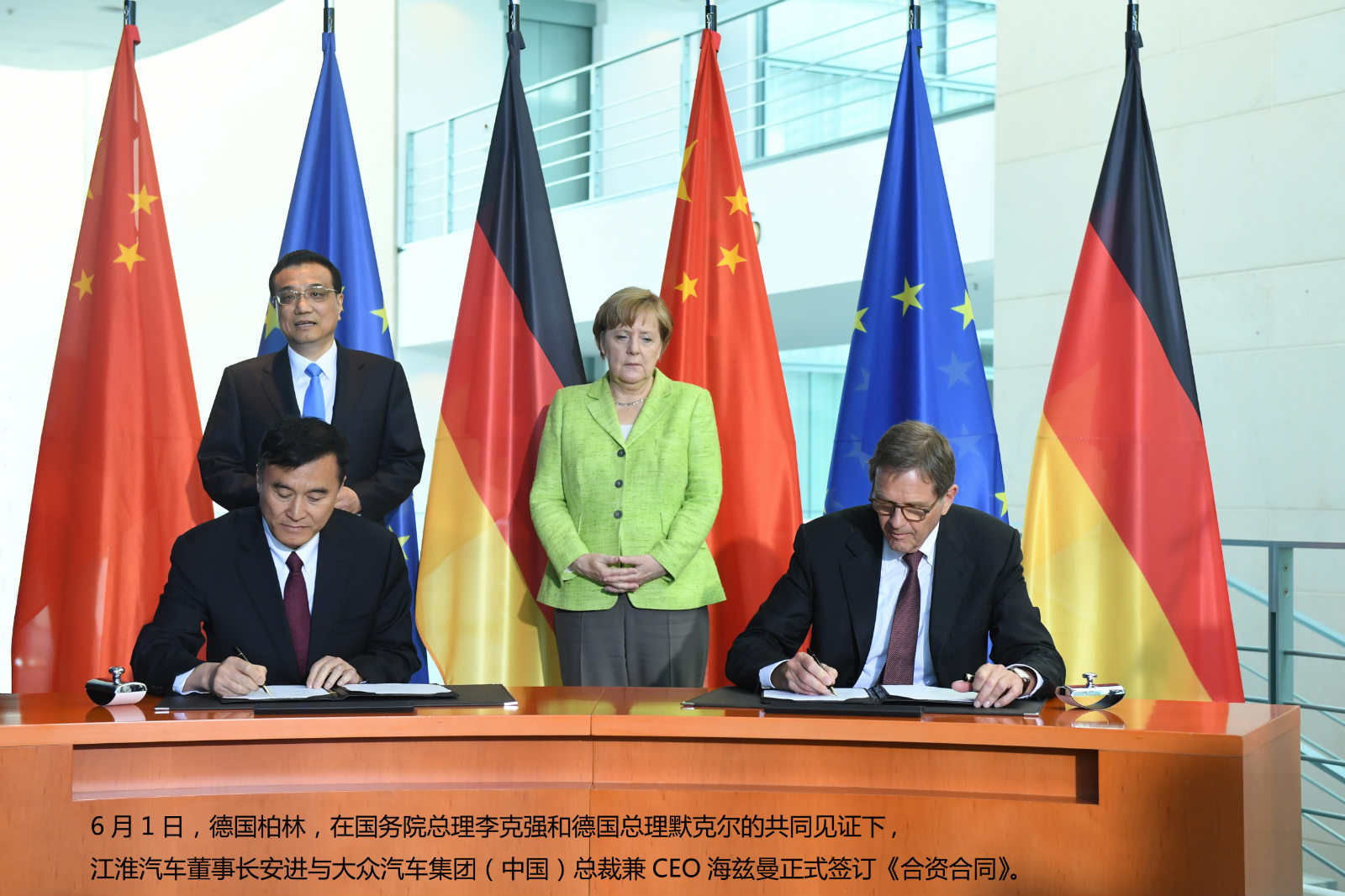 6月1日,在国务院总理李克强和德国总理默克尔(Angela Merkel)的共同见证下,安徽江淮汽车集团股份有限公司(以下简称江淮汽车)与大众汽车集团于德国柏林正式签署合资企业协议。该协议的签署标志着中德两国合作新的里程碑。根据该协议,合作双方将共同成立一家股比各占50%的合资企业,进行新能源汽车的研发、生产和销售并提供相关移动出行服务。
