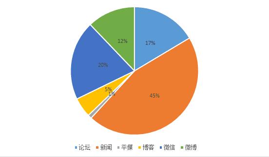 媒体分类上,新闻类传播占比最高,占总传播量的45%,其次是微信和论坛分别占传播量的20%和17%,微博、博客、平媒则分别占总传播量的12%,5%,1%。
