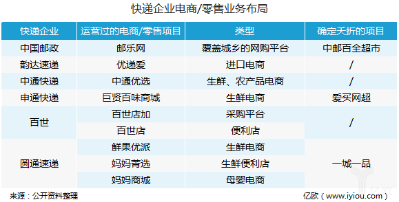 除了顺丰,在主流的快递企业中,中国邮政、三通一达以及百世皆有布局电商以及便利店业务。