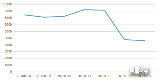 1月第2周共计监测物流上市公司数据52412条,传播走势在前五天略微上升,后两天大幅下降。